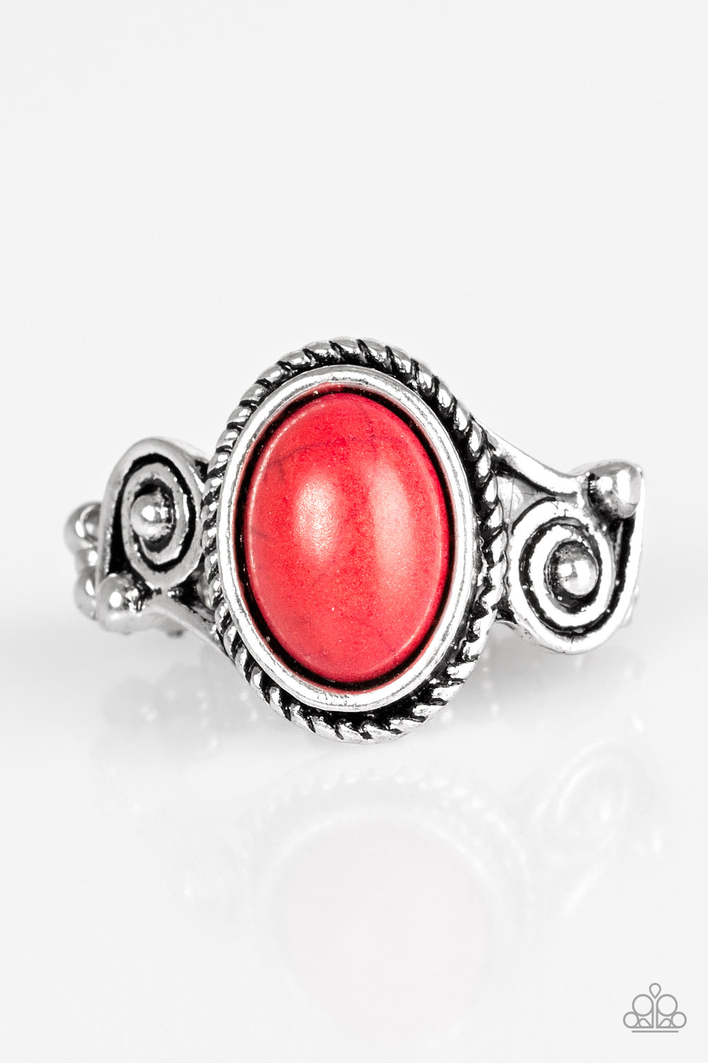 Brushed in an antiqued shimmer, glistening ribbons of silver swirl into an ornate band. A fiery red stone is pressed into the center of a textured silver frame for a seasonal finish. Features a dainty stretchy band for a flexible fit.