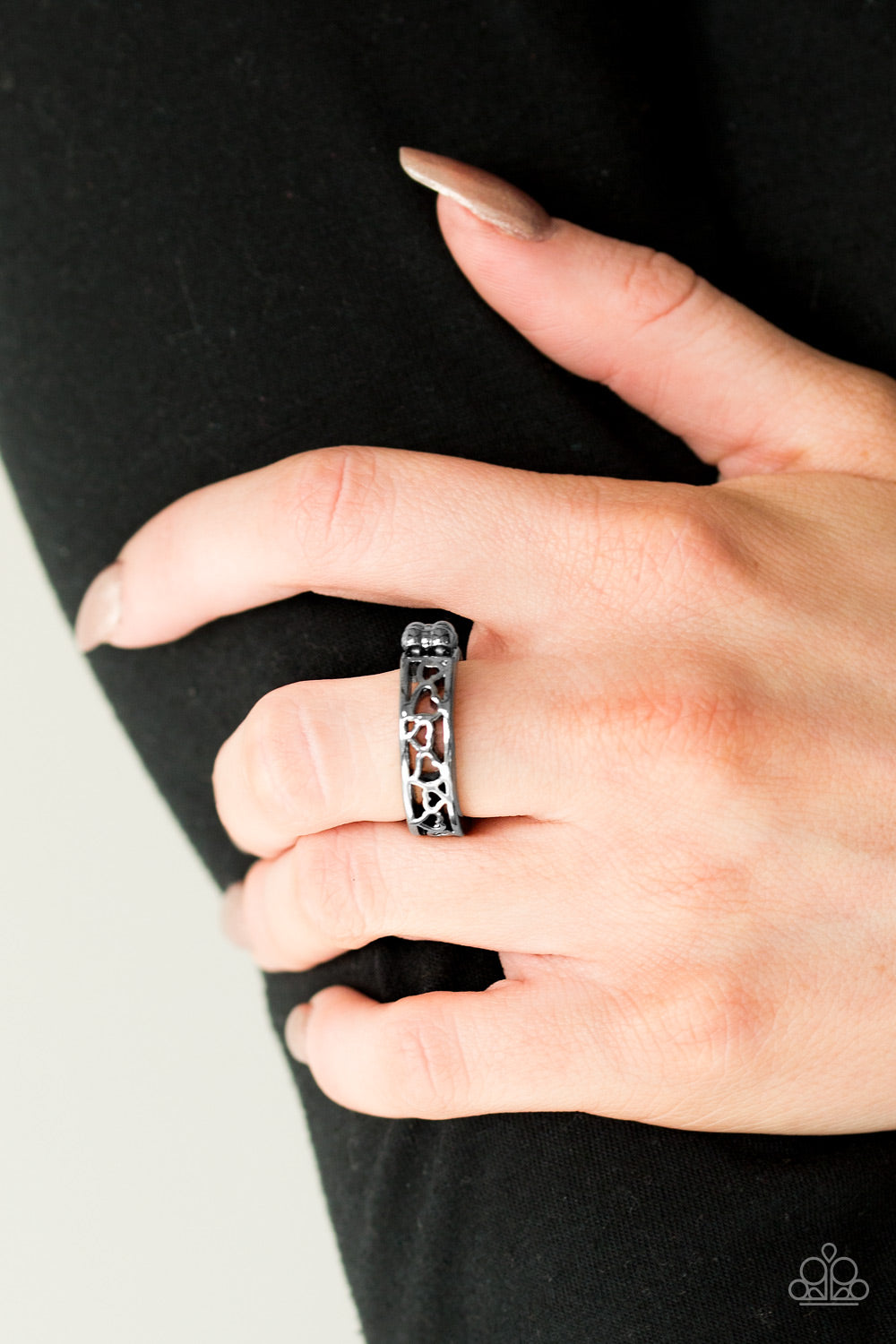 Dainty gunmetal heart silhouettes connect down the center of a shimmery gunmetal band, creating an airy frame. Features a dainty stretchy band for a flexible fit.