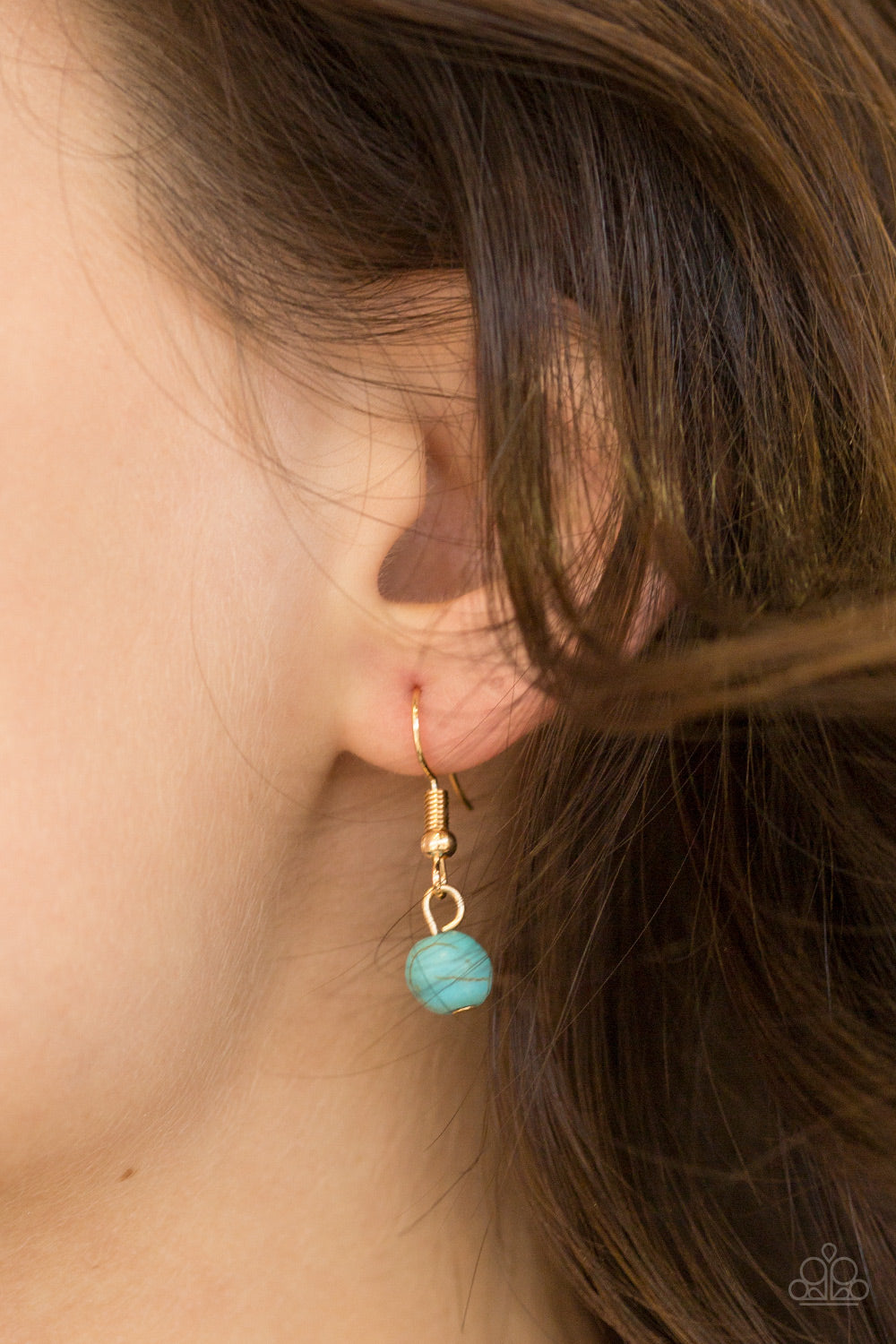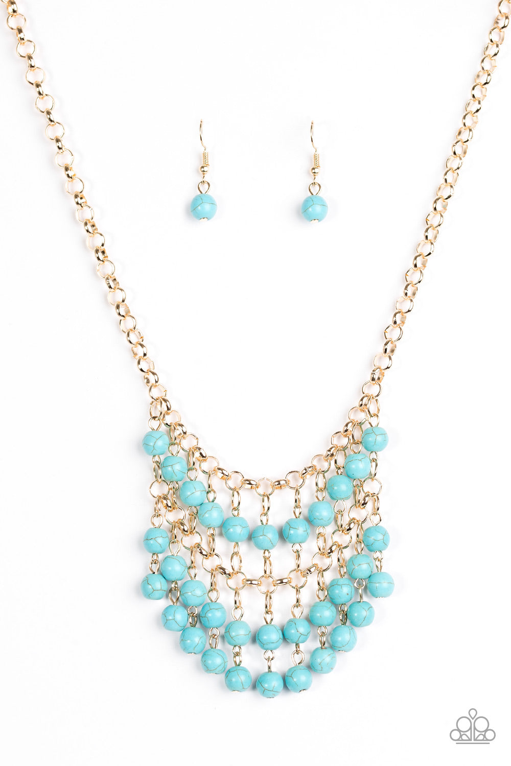 Refreshing turquoise stone beads swing from the bottom of a netted gold chain, creating a bold artisanal fringe below the collar. Features an adjustable clasp closure.