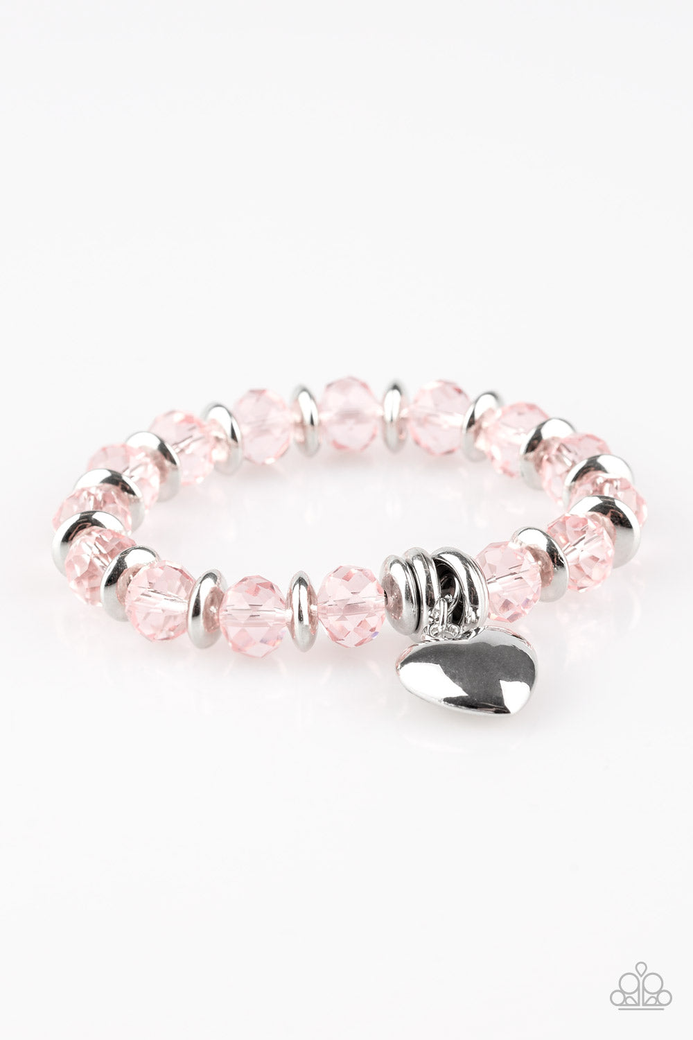 Sparkling pink crystal-like beads and shimmery silver accents are threaded along a stretchy band. An oversized silver heart charm swings from the wrist for a whimsical finish.