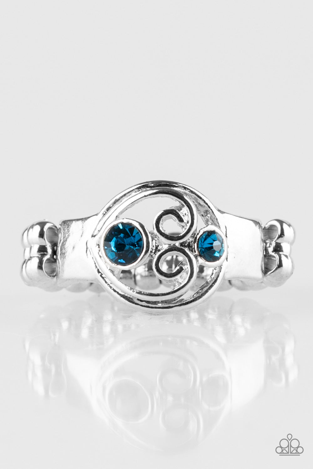 Glittery blue rhinestones flank a glistening silver frame that swirls into a charming heart-shaped centerpiece. Features a dainty stretchy band for a flexible fit.