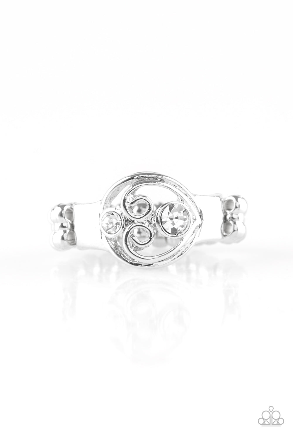 Glittery white rhinestones flank a glistening silver frame that swirls into a charming heart-shaped centerpiece. Features a dainty stretchy band for a flexible fit.