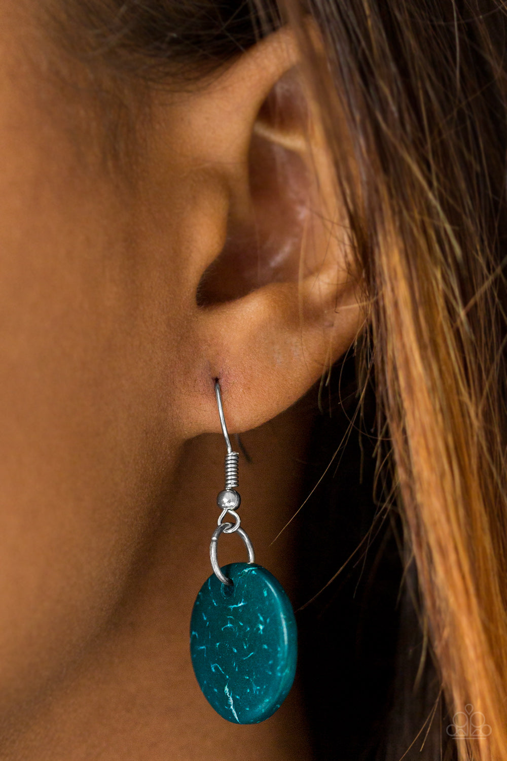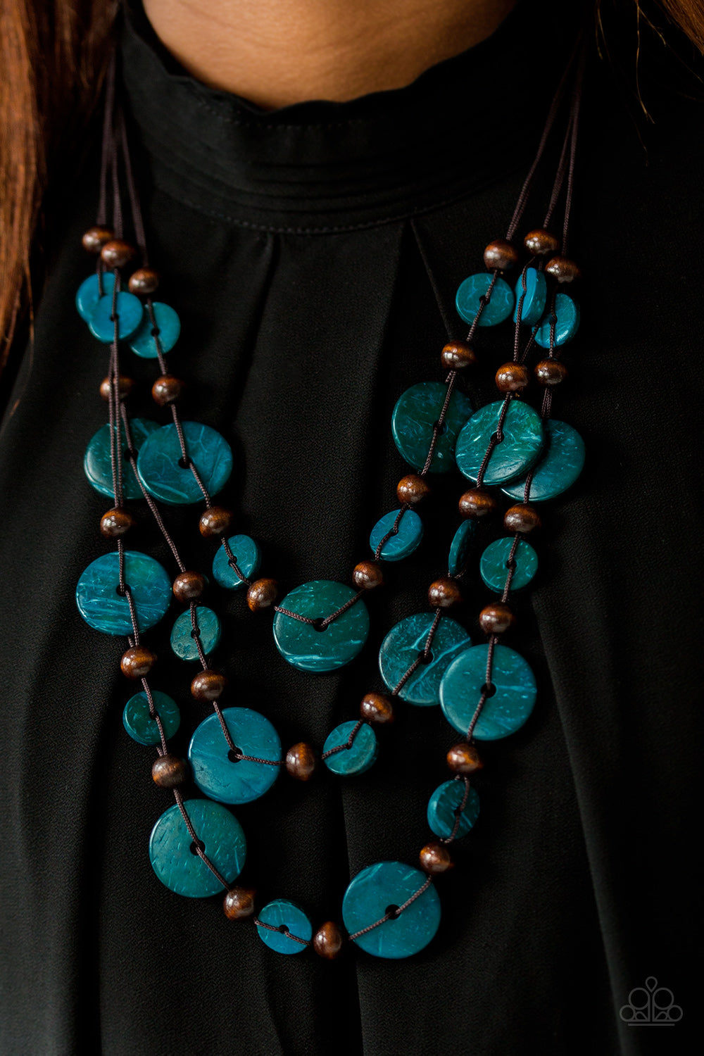 Brushed in a distressed finish, blue and brown wooden beads trickle along three strands, creating a summery look down the chest. Features a button loop closure.