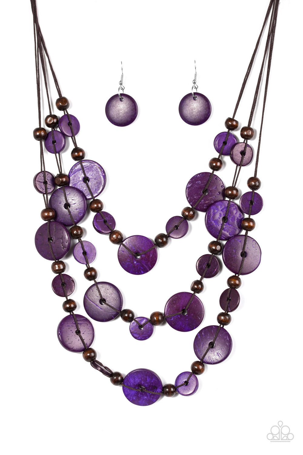 Brushed in a distressed finish, purple and brown wooden beads trickle along three strands, creating a summery look down the chest. Features a button loop closure.