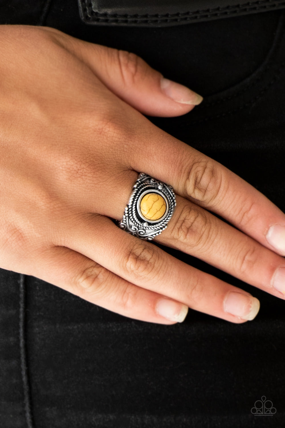 A sunny yellow stone is pressed into an ornate silver band radiating with rope-like and studded textures for a seasonal look. Features a stretchy band for a flexible fit.