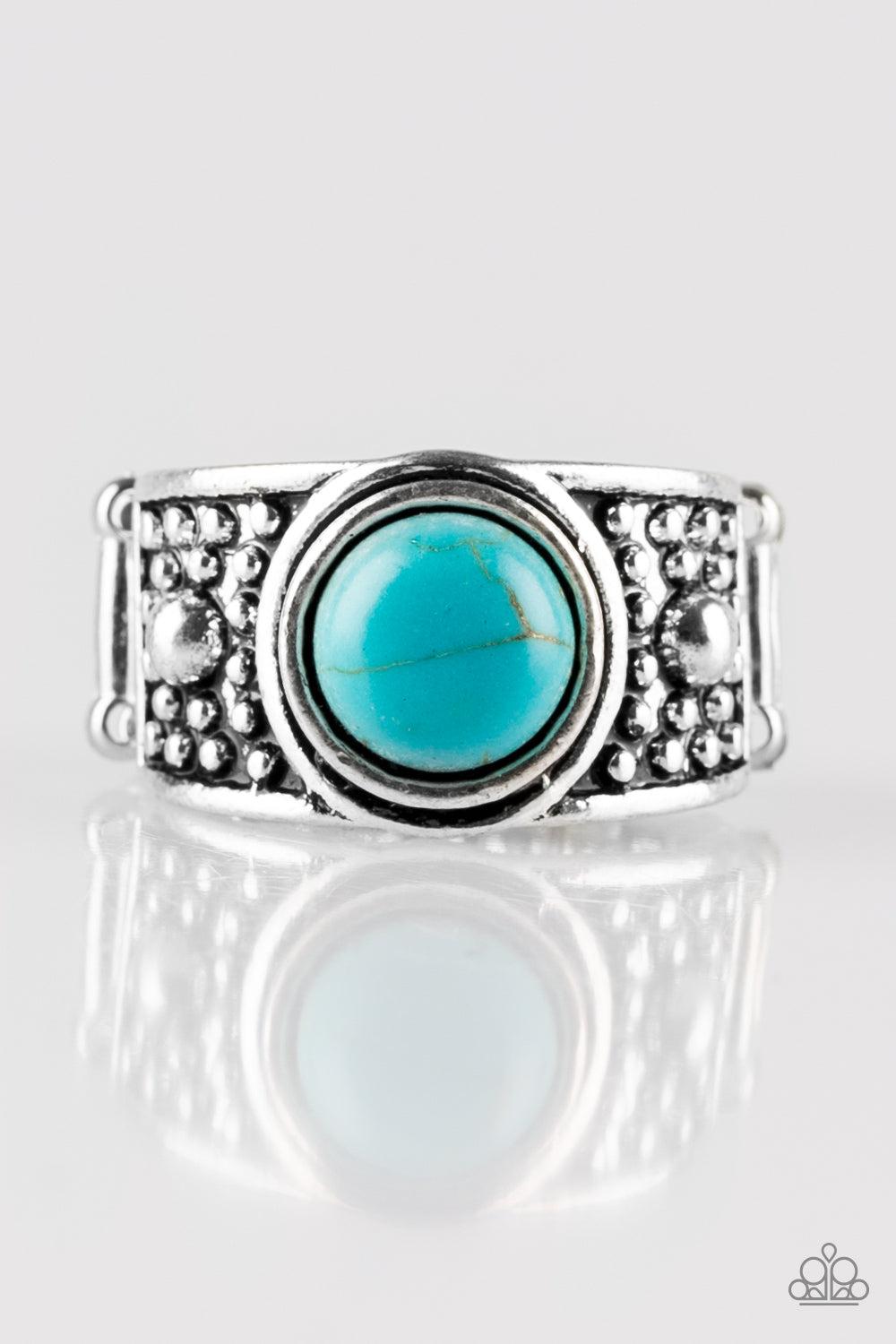 A refreshing turquoise stone is pressed into the center of an antiqued silver frame radiating with studded textures for an artisan inspired look. Features a stretchy band for a flexible fit.