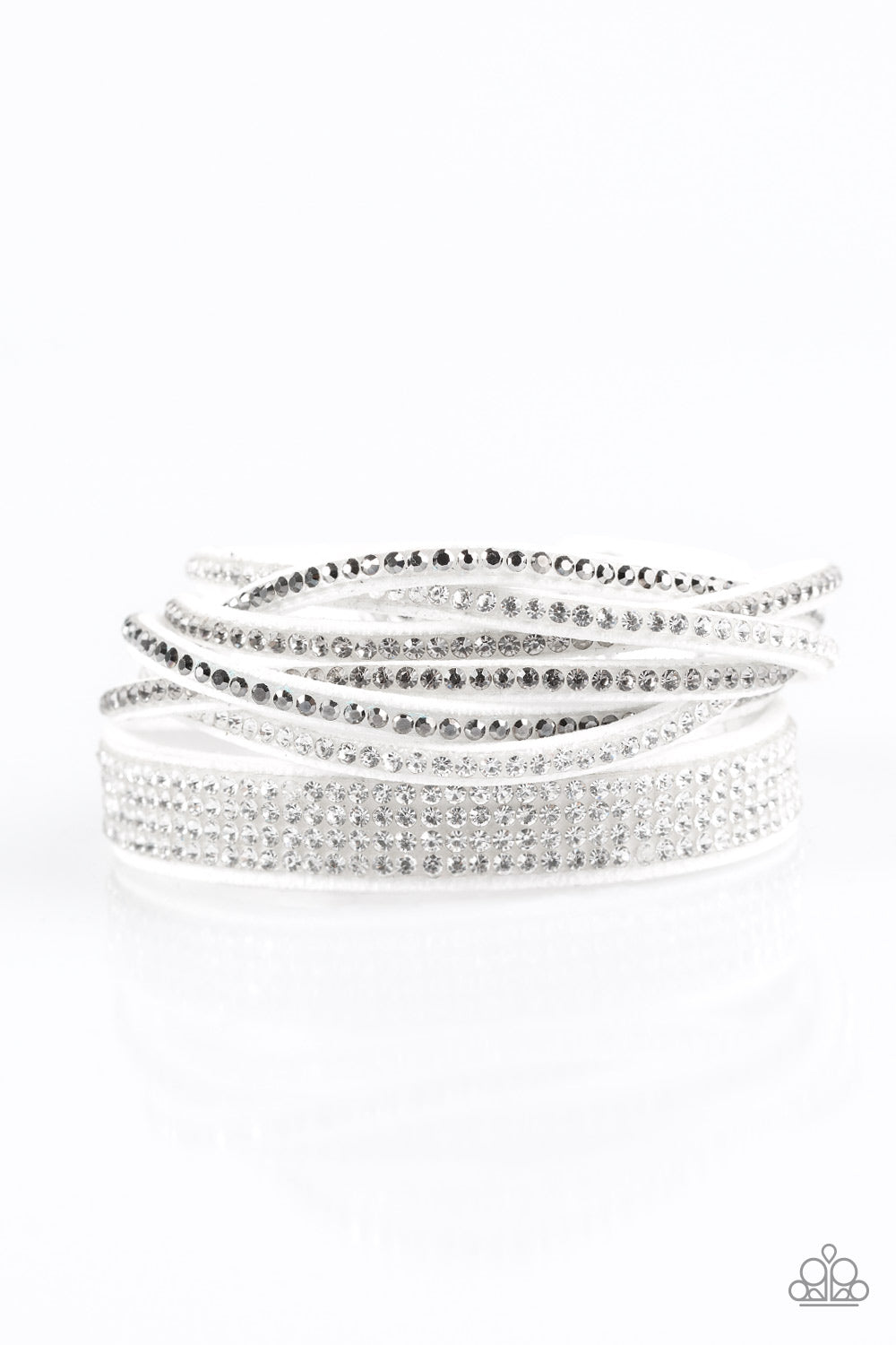 An elongated white suede band is encrusted in sections of braided white, smoky, and hematite rhinestones and rows of neatly stacked white rhinestones. The elongated band double wraps around the wrist for a fierce one-of-a-kind look. Features an adjustable snap closure.
