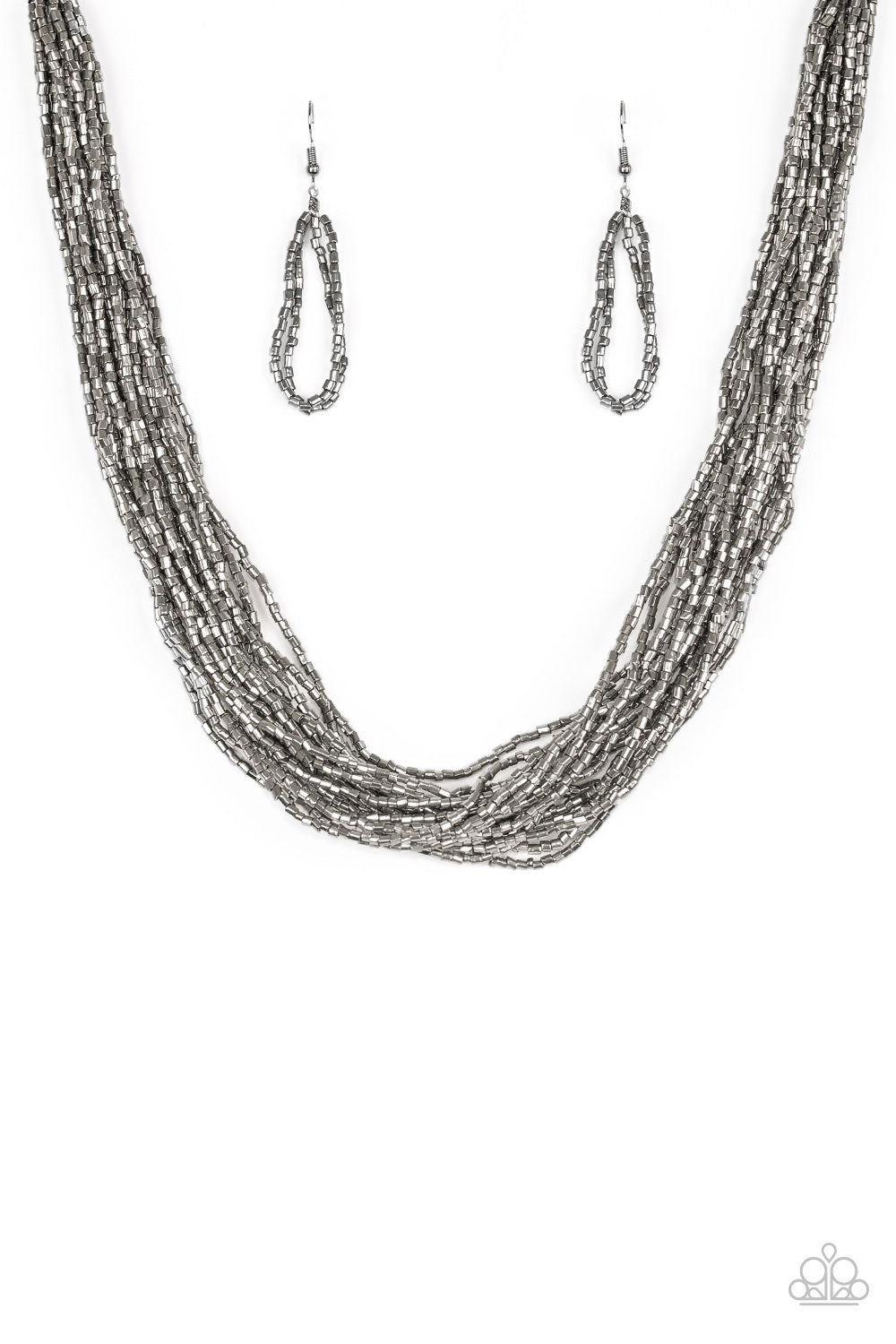 Strands of glistening gunmetal seed beads subtlety twist below the collar, coalescing into a blinding shimmer. Features an adjustable clasp closure.
