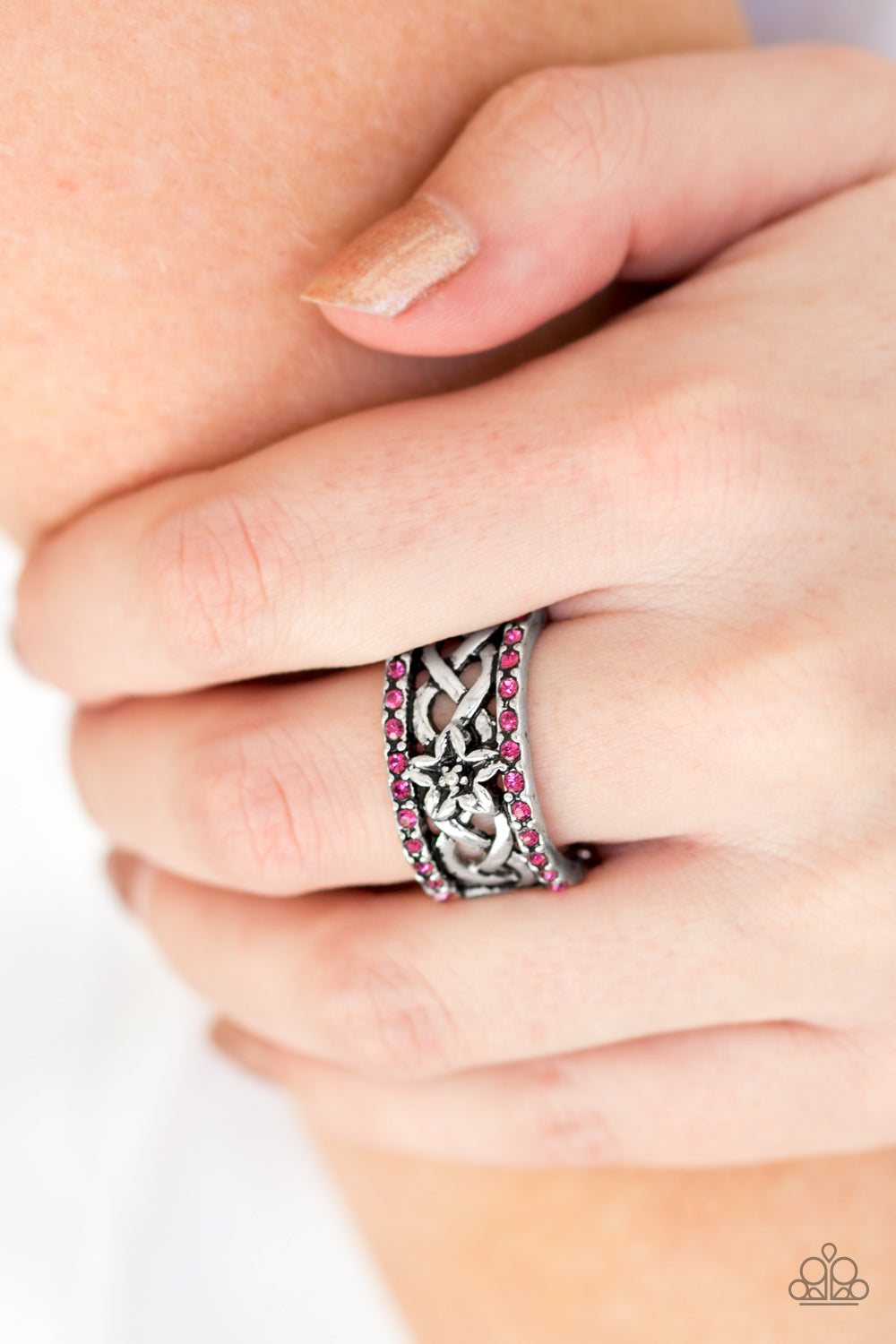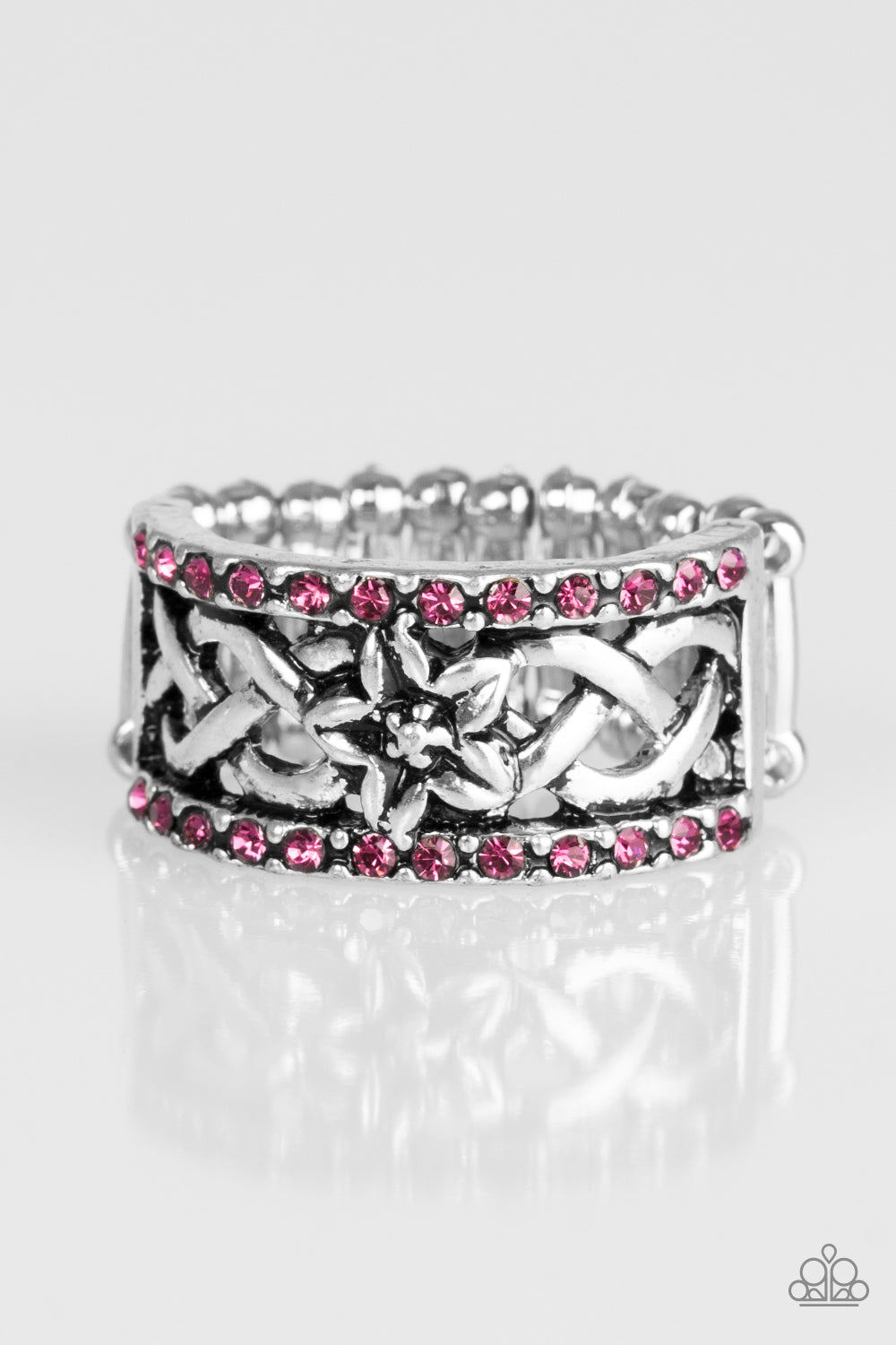 Glistening ribbons of silver crisscross across the finger, coalescing into an airy band. Infused with a summery floral center, the shimmery band is encrusted in rows of glittery pink rhinestones for a seasonal look. Features a stretchy band for a flexible fit.