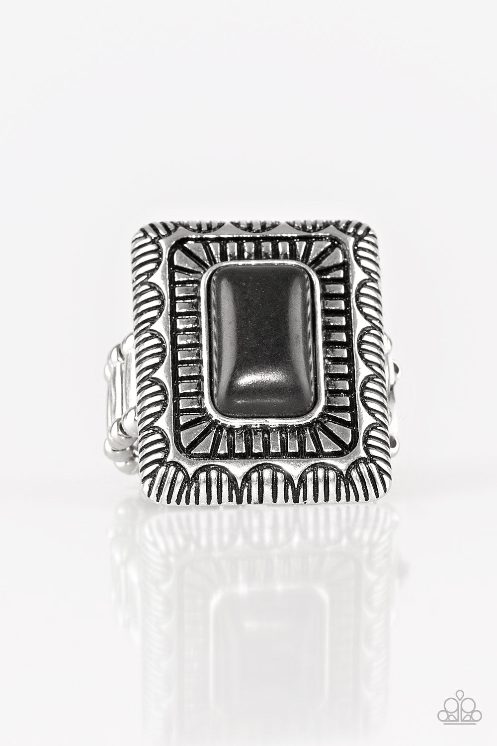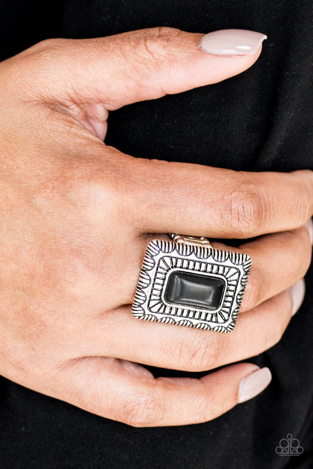 Chiseled into a tranquil rectangle, a smooth black stone is pressed into a rectangular silver frame radiating with tribal inspired textures for a seasonal look. Features a stretchy band for a flexible fit.