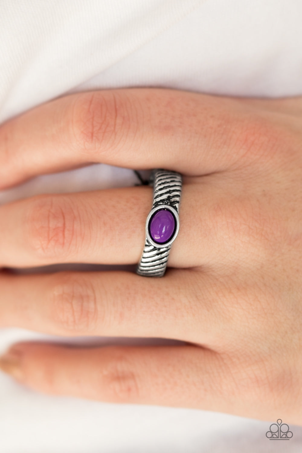 A vivacious purple bead is pressed into a dainty silver band radiating with striped texture for a seasonal look. Features a dainty stretchy band for a flexible fit.